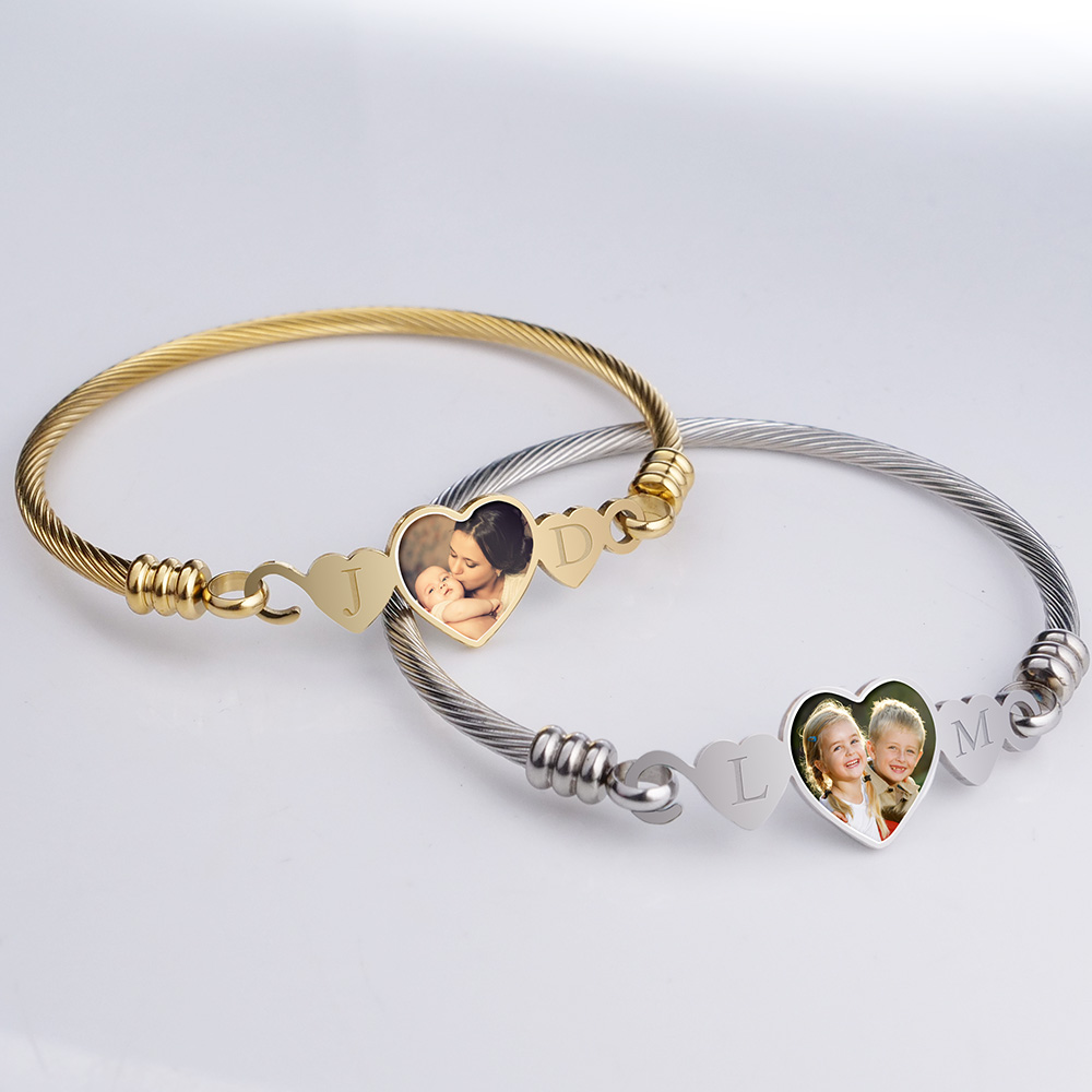 Stainless Steel Photo Engraved Heart Shaped Bangle Bracelet with Initials