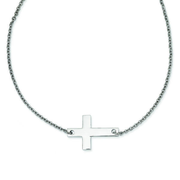 This Stainless Steel Small Sideways Cross Necklace weighs approximately 7.67 grams. Cross is Polished and Measures at 1.1 Inches Wide x Over 3/4 Inch Tall 21 Inch Stainless Steel Chain Included.