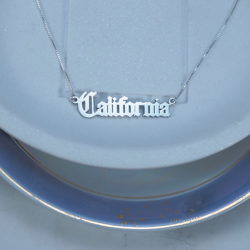 high polishedState Name Nameplate, written in an Old English style font, any state or city is available. It is available in Solid .925 Sterling Silver, 14k Gold Plated, 14k Rose Gold Plated or solid 14k Gold.