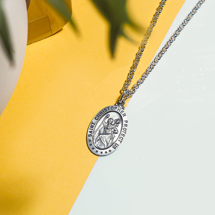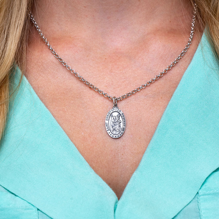 Sterling Silver Antiqued Saint Christopher Oval Religious Medal
