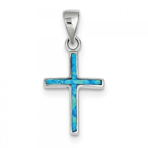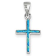 Sterling Silver Blue Inlay Created Opal Thin Cross Pendant