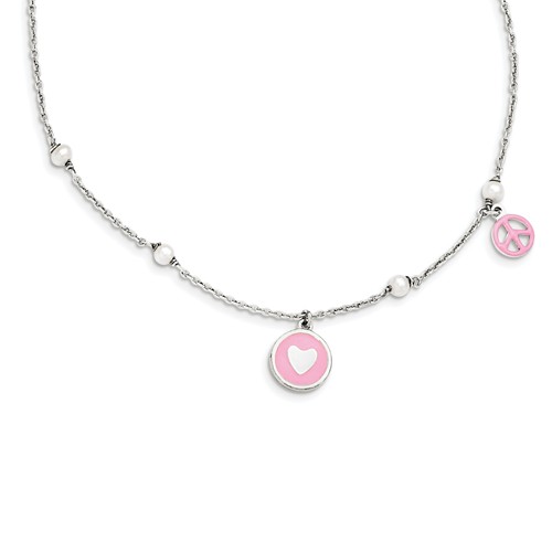 Sterling Silver Childrens Pearls & Enameled Peace Sign Charm Link Bracelet