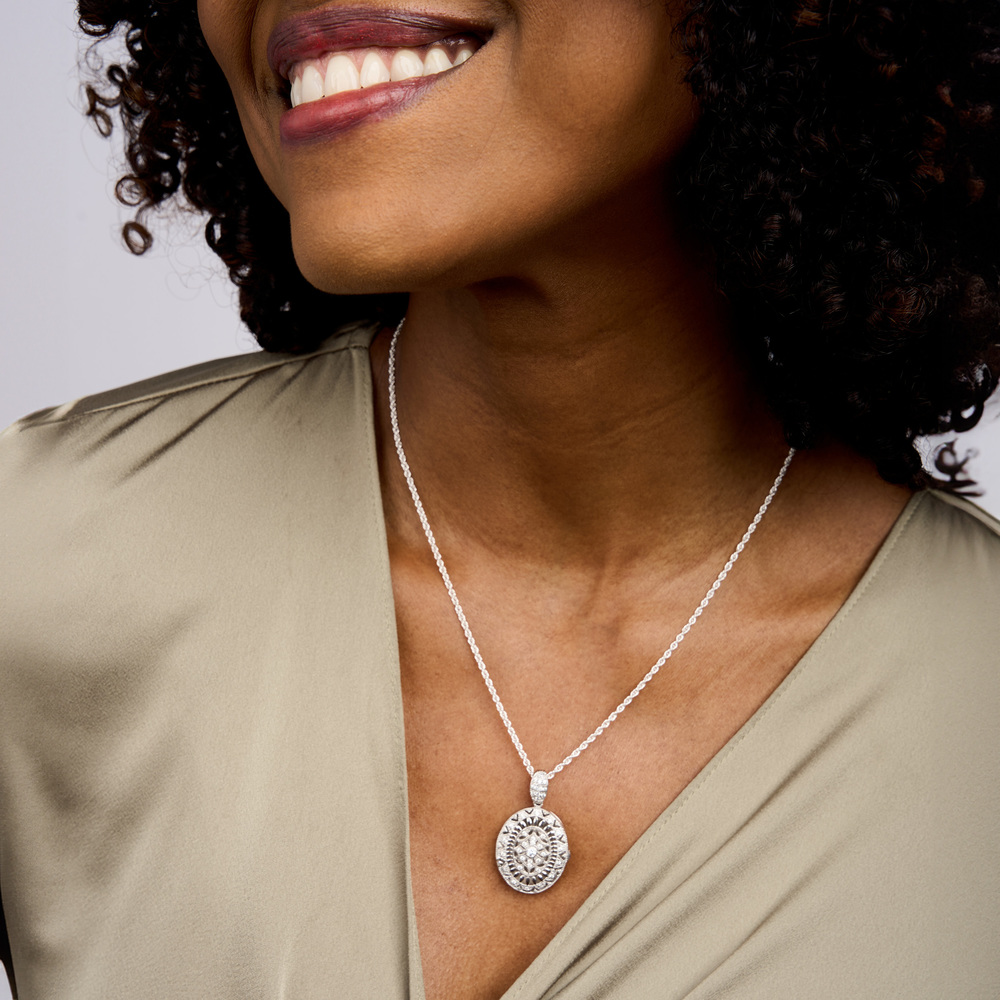 What is on the front of the locket? Hand Engraved w/ Cubic Zirconia