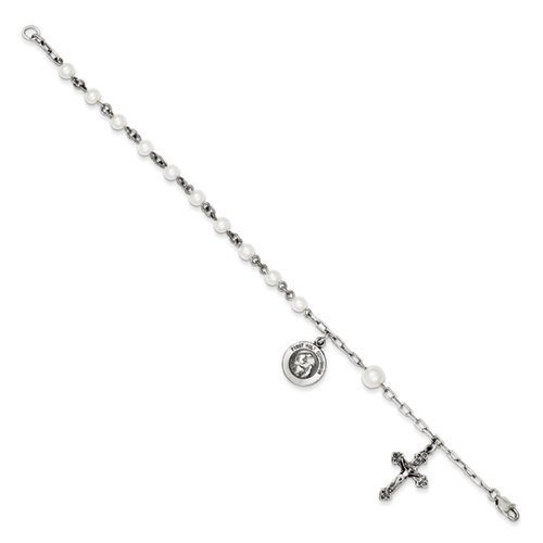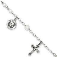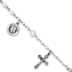 Sterling Silver Cultured Pearl Rosary Bracelet /with First Holy Communion Medal