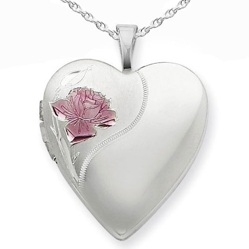 This Heart Locket is .925 Solid Sterling Silver and holds 2 photos. The front of this locket has a beautifully designed enamel flower on the front in pink. You can engrave this stunning locket with a personal message on the inside and reverse. This is the perfect gift for any occasion.