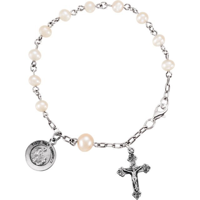 Sterling Silver First Holy Communion Freshwater Cultured Pearl Rosary Bracelet