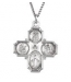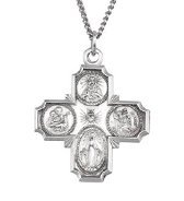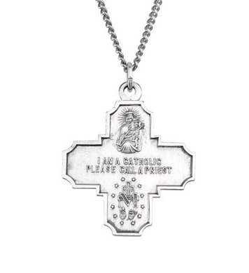 This 14K Solid Sterling Silver medal also known as a Cruciform. It is four medals in one. A Scapular medal with Our Lady of Mount Carmel is on the back. The Sacred Heart is at the top Saint Christopher in the right;Miraculous at the bottom;and saint Joseph on the left. The words "I am Catholic, please call a priest" are inscribed on the back to indicate a person wants their last sacraments.