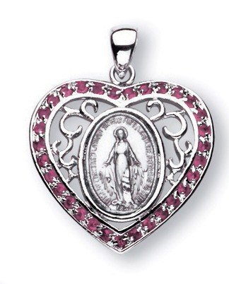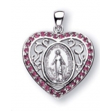 The Traditional Shape Medal is in Heart Shaped Setting with 31 Swarovski Crystal Set Cubic Zircons Embellished Rays of Light around Fancy Border is Adorned with finely detailed Blessed Mother Mary with rays coming out of her extended hands.The Reverse Side of the Medal Portrays an "M" with a Cross on the top and the "Sacred Hearts" underneath surrounded by Twelve Stars. Die striking only the finest grade solid Sterling Silver stock, enables the intricate details of the coined Precious