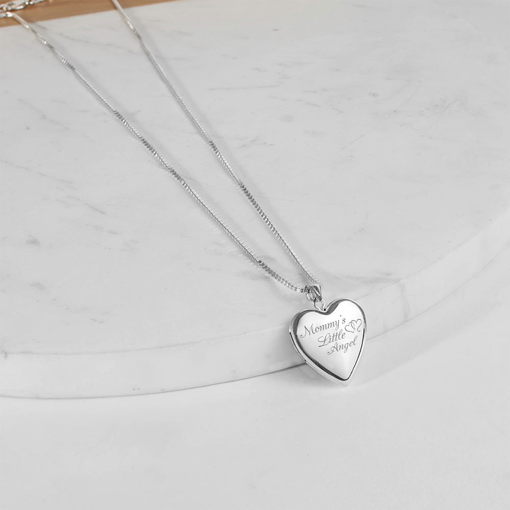 This Heart Locket is .925 Solid Sterling Silver and holds 2 photos. The front of this locket is engraved with Mommys Little Angel. This beautiful locket can be engrave with a personal message on the inside and reverse side. This is the perfect gift for any occasion.