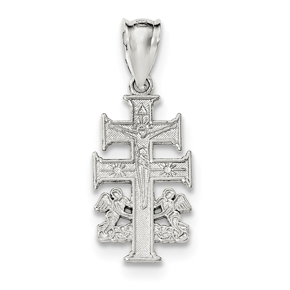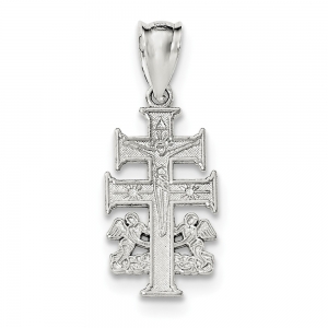 Sterling Silver Polished Caravaca Double Cross w/Angels Crucifix Pendant