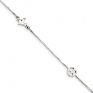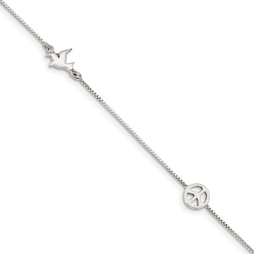 Sterling Silver Polished Dove & Peace Sign with 1in ext. Anklet