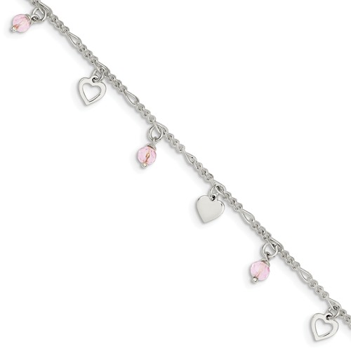 Sterling Silver Polished Heart and Rose Glass with 1in ext. Anklet