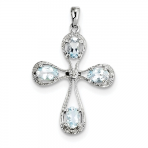 Sterling Silver Rhodium Aqua & Diamond Cross Pendant