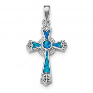 Sterling Silver Rhodium-plated CZ & Created Opal Cross Pendant