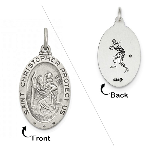 Sterling Silver Saint Christopher Double Sided Baseball Oval Religious Medal