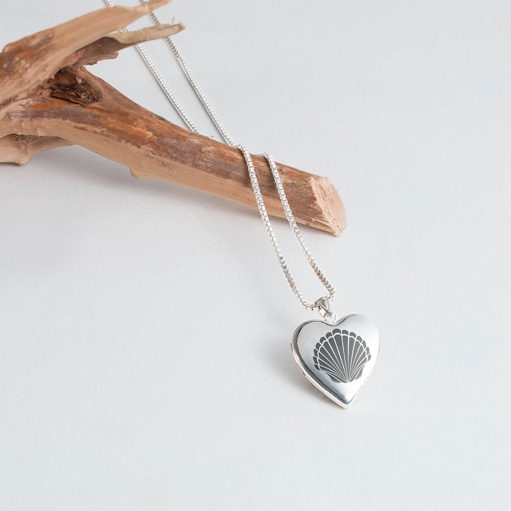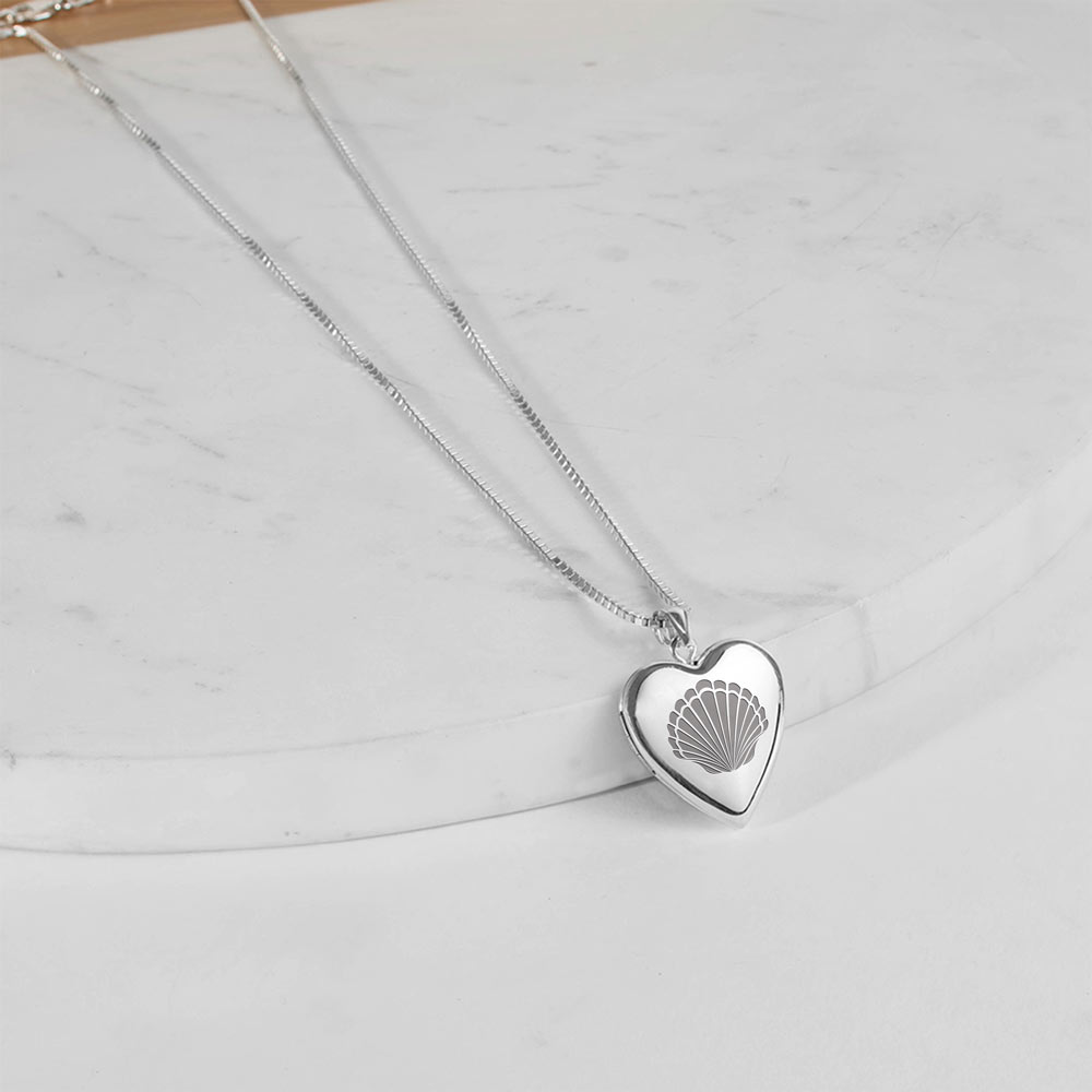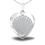 This Heart Locket is .925 Solid Sterling Silver and holds 2 photos. The front of this locket has an engraved seashell on the front. You can engrave this stunning locket with a personal message on the inside and reverse. This is the perfect gift for any occasion.