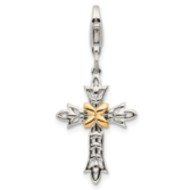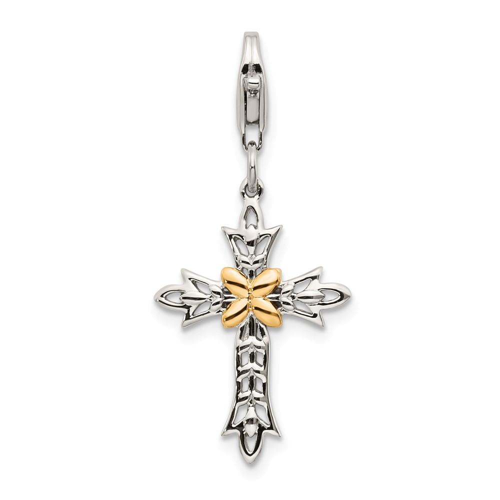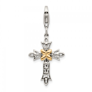 Sterling Silver w/14k 3-D Antiqued Cross w/Lobster Clasp Charm