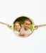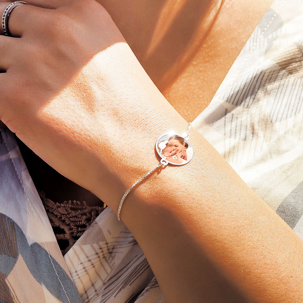 Held together by a rounded box chain, with a round photo charm attached at the center.